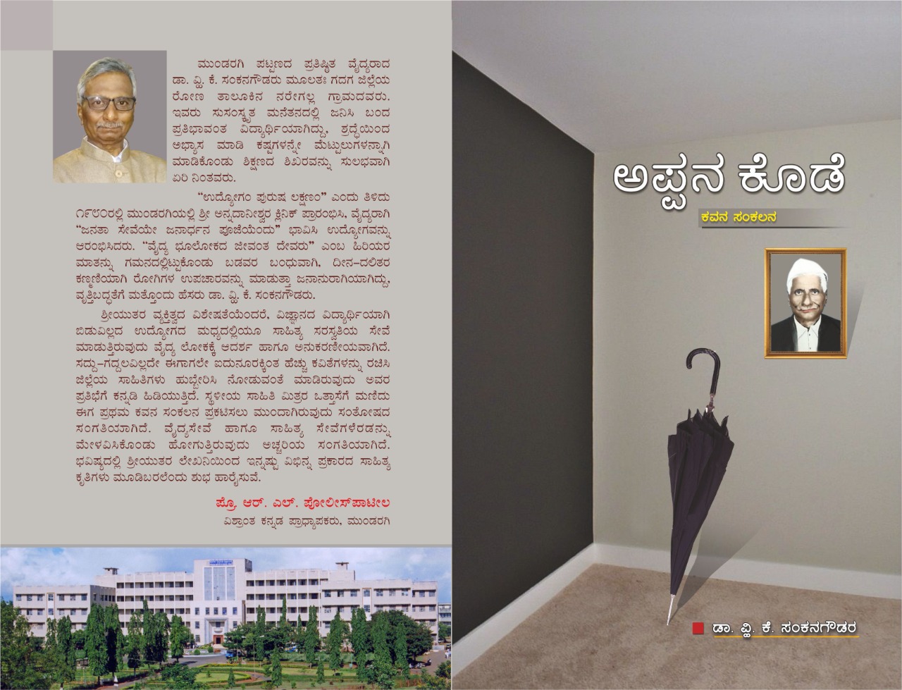 ಡಾ.ವಿ.ಕೆ.ಸಂಕನಗೌಡರ ಅವರು ನಾಡಿನ ಒಬ್ಬ ಉತ್ತಮ ವೈದ್ಯರಾಗಿದ್ದು, ನಿತ್ಯ ನೂರಾರು ಜನರ ರೋಗಗಳನ್ನು ಗುಣಪಡಿಸುತ್ತಿದ್ದಾರೆ. ಅದರ ಜೊತೆಗೆ ಉತ್ತಮ ಕವನಗಳನ್ನು ಬರೆಯುತ್ತಿರುತ್ತಾರೆ. ಅವರ ಪ್ರಥಮ ಕವನ ಸಂಕಲನ ಅಪ್ಪನ ಕೊಡೆ ಬಿಡುಗಡೆಗೊಳ್ಳುತ್ತಿದೆ. ಅವರು ಇನ್ನೂ ಹೆಚ್ಚಿನ ಸಾಹಿತ್ಯ ಸೇವೆ ದೊರೆಯಬೇಕು ಎಂದು ನಿವೃತ ಉಪನ್ಯಾಸಕ ಆರ್.ಎಲ್.ಪೊಲೀಸಪಾಟೀಲ ತಿಳಿಸಿದರು.