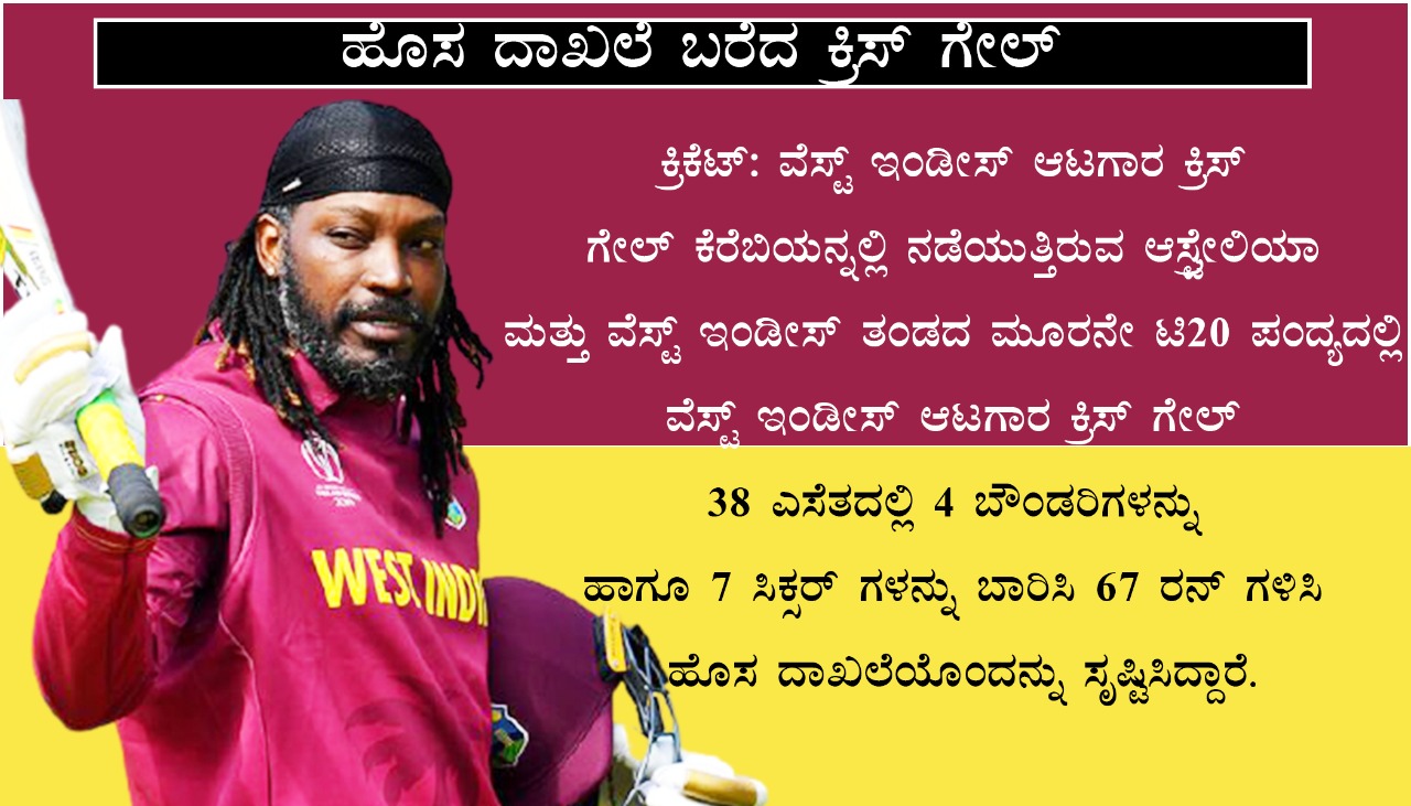 ಕ್ರಿಕೆಟ್: ವೆಸ್ಟ್ ಇಂಡೀಸ್ ಆಟಗಾರ ಕ್ರಿಸ್ ಗೇಲ್ ಕೆರೆಬಿಯನ್ನಲ್ಲಿ ನಡೆಯುತ್ತಿರುವ ಆಸ್ಟ್ರೇಲಿಯಾ ಮತ್ತು ವೆಸ್ಟ್ ಇಂಡೀಸ್ ತಂಡದ ಮೂರನೇ ಟಿ20 ಪಂದ್ಯದಲ್ಲಿ ವೆಸ್ಟ್ ಇಂಡೀಸ್ ಆಟಗಾರ ಕ್ರಿಸ್ ಗೇಲ್ 38 ಎಸೆತದಲ್ಲಿ 4 ಬೌಂಡರಿಗಳನ್ನು ಹಾಗೂ 7 ಸಿಕ್ಸರ್ ಗಳನ್ನು ಬಾರಿಸಿ 67 ರನ್ ಗಳಿಸಿ ಹೊಸ ದಾಖಲೆಯೊಂದನ್ನು ಸೃಷ್ಟಿಸಿದ್ದಾರೆ.